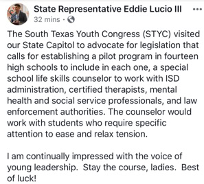 As I reflect on this trip that happened nearly a week ago I still cannot wrap my mind around all we were able to accomplish. From being treated like family by Representative J.M. Lozano to taking a picture with Representative James Tallerico. Our trip to the Texas State Captiol was filled with uncontrollable laughter, great food, and most importantly desire amongst us as an organization to help the future high schoolers to come.